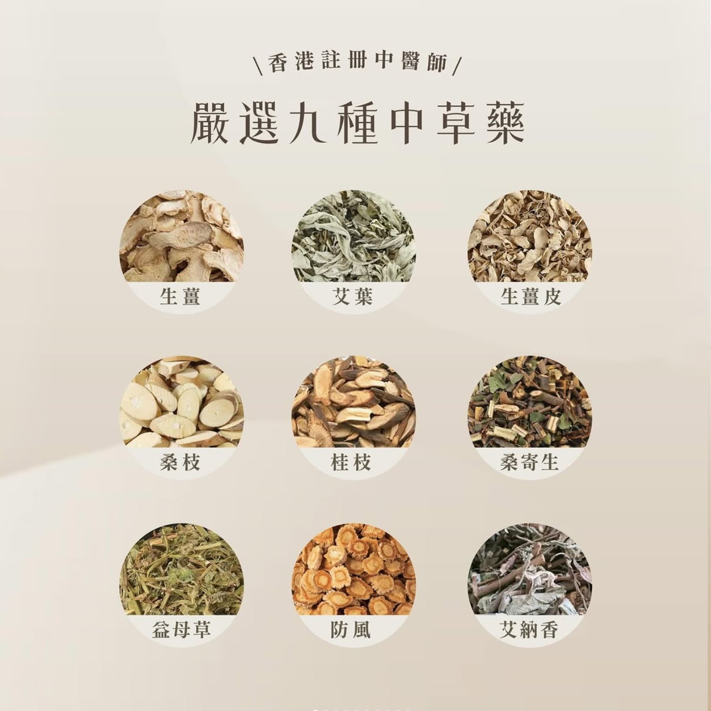 Artemisiae Argyi Folium (Argy Wormwood Leaf), Zingiberis Rhizoma Recens (Fresh Ginger), Zingiberis Rhizoma Recens Peel (Ginger Peel), Cinnamomi Ramulus (Cassiabarktree Twig), Mori Ramulus (Mulberry Twig), Taxilli Herba (Chinese Taxillus Herb), Saposhnikoviae Radix (Divaricate Saposhnikovia), Leonuri Herba (Common Motherwort Herb), Blumea Balsamifera (Blumea Camphor)