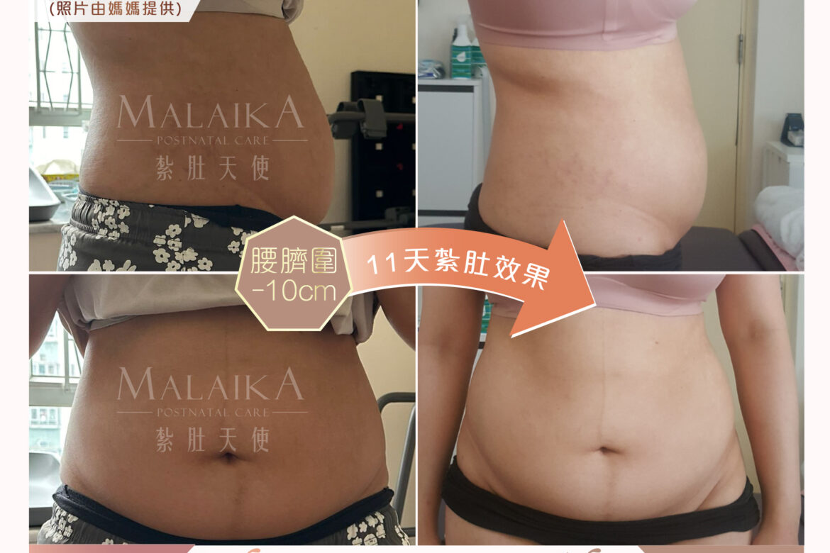 我在給媽媽進行療程,大部份是在產後「氣血兩虛」的情況下開始。如果媽媽坐月情況比較好、飲食休息得宜,乖乖保暖不沾涼水,確實會很快見效,可收減10-12CM。但是有些媽媽本身體質狀況已很差,過份按摩及心急紮肚令呼吸不暢順,卻會適得其反,不能強行完成,否則身心也造成壓力。